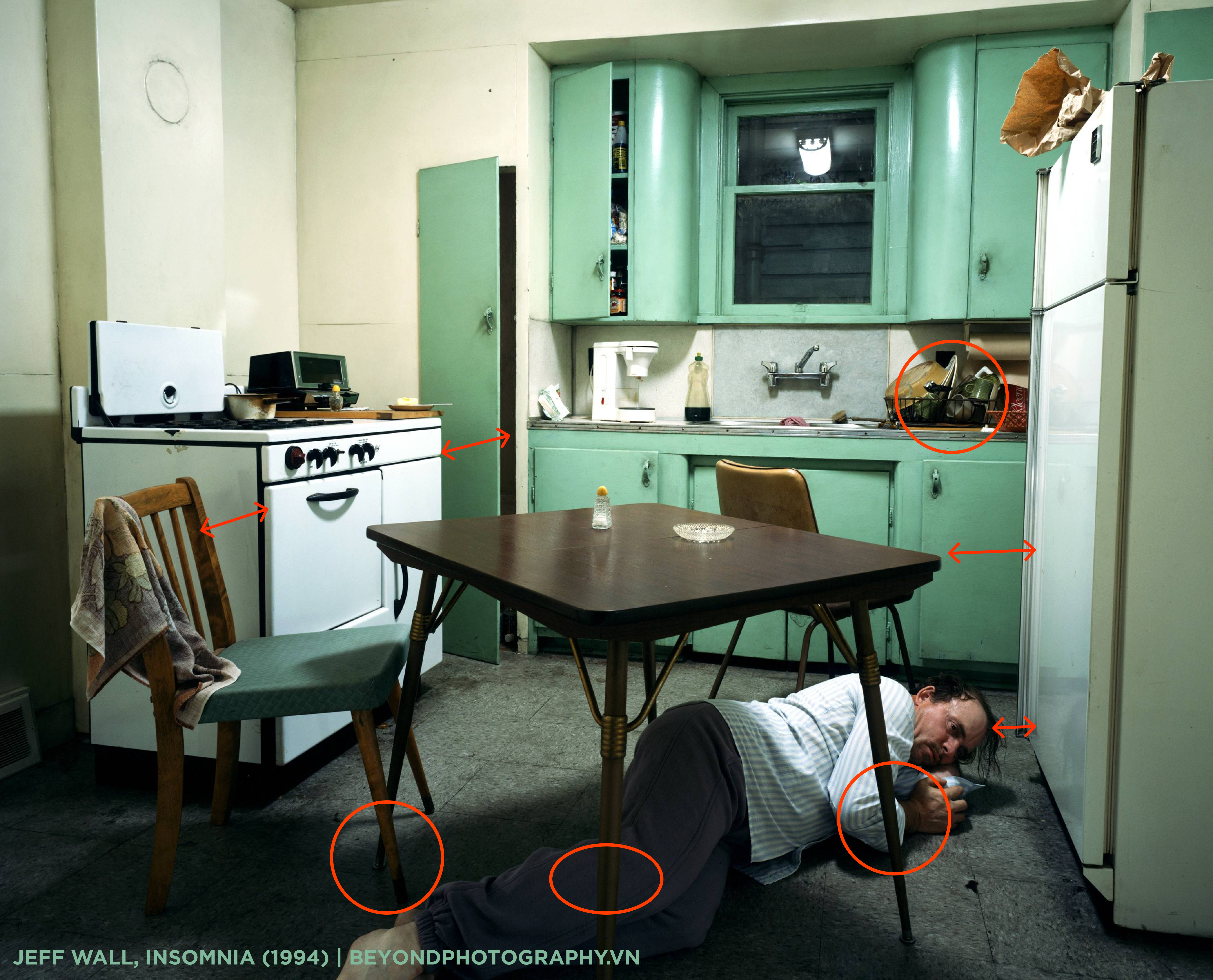 Tấm ảnh không đi kèm quá nhiều thông tin cho sẵn, Jeff Wall chỉ cho chúng ta biết về căn bệnh mất ngủ thông qua tựa đề. Còn những thông tin khác được ẩn giấu thông qua các chi tiết, và cả cách sắp đặt bố cục.